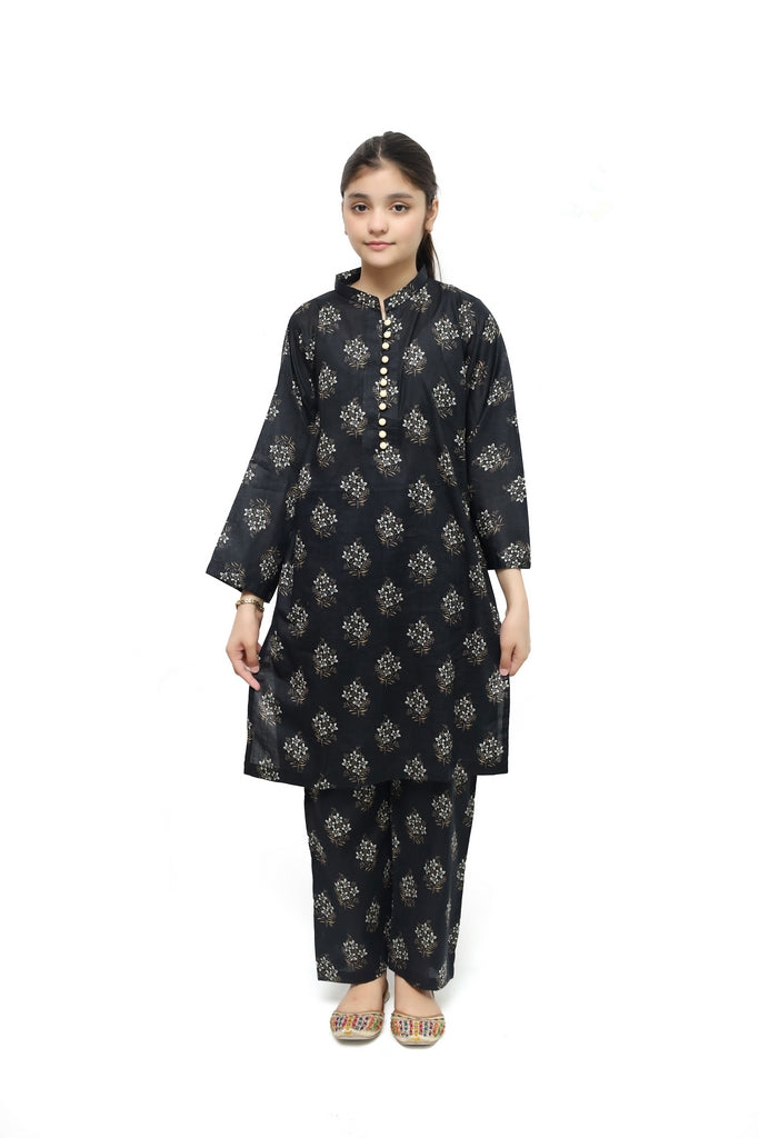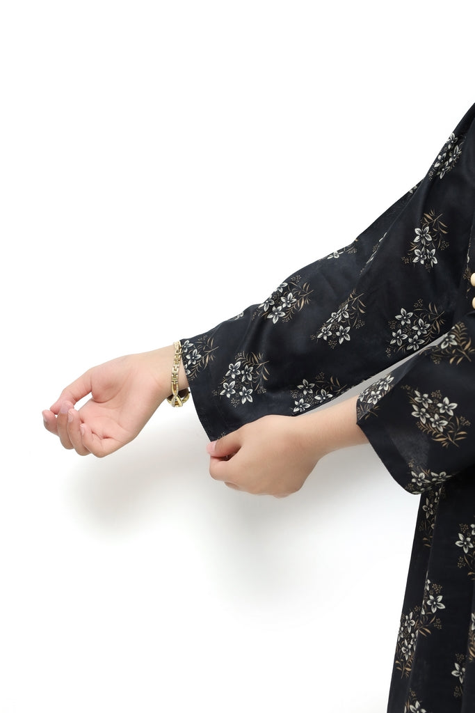 Beautiful black lawn suit designed for girls featuring delicate olive and white floral prints. This 2-piece stitched outfit is adorned with fabric loops and decorative buttons that add a touch of elegance. Crafted from soft, breathable lawn fabric ideal for warm weather wear. The intricate floral pattern brings a fresh, feminine appeal perfect for school, casual outings, or special occasions. Quality stitching ensures durability and comfort for everyday wear.