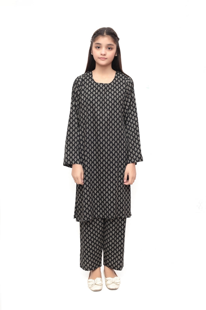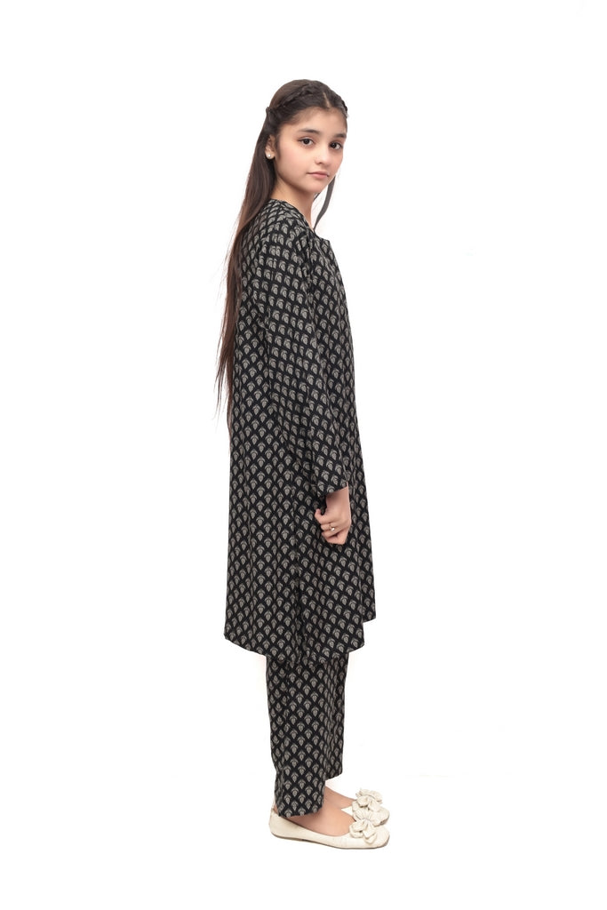 Liven up your little one's wardrobe with our Premium Quality Marina Colour Black, Printed with White Motifz on 2 pc suit ! For Winters, this suit is not only high-quality, but also comfortable for all-day wear Casuals and Formals. Perfect for any stylish girl, this Stitched 2 pc suit is a must-have.