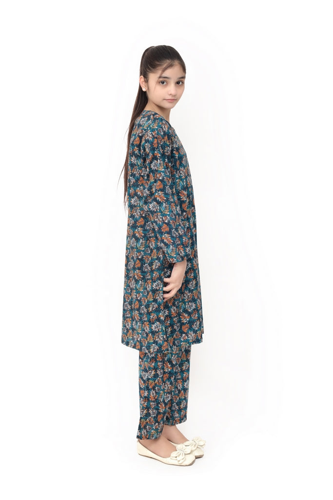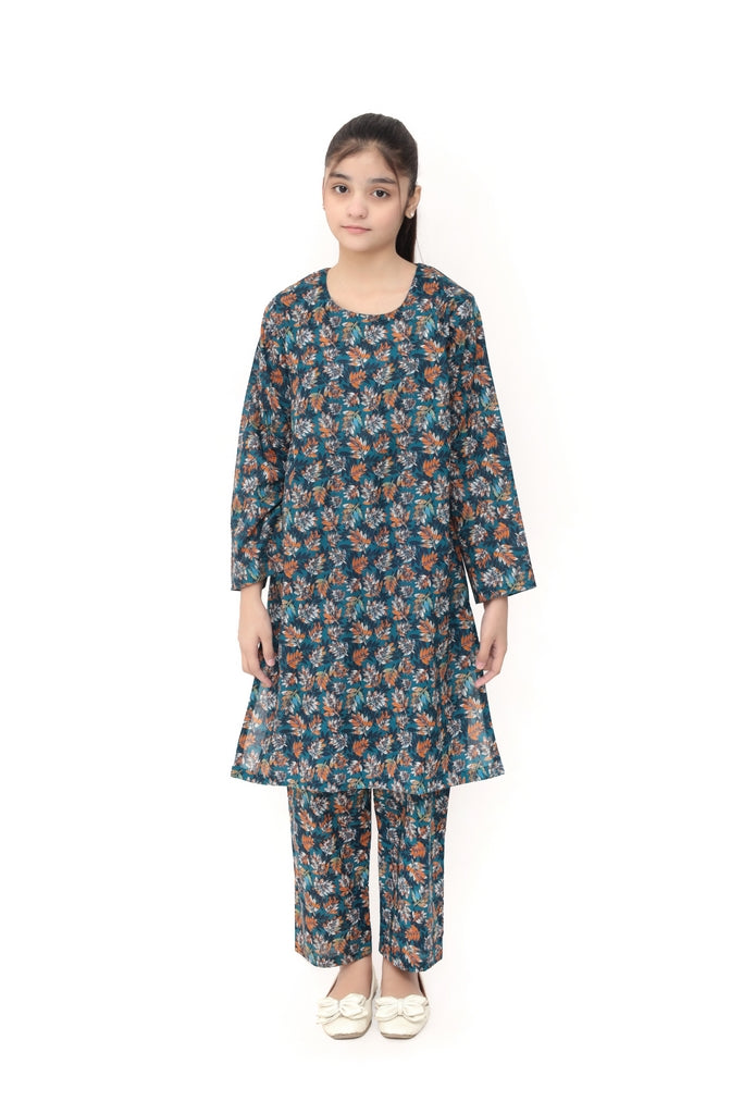 Liven up your little one's wardrobe with our Premium Quality Stitched 100% Soft Digital Lawn Blue Colour Printed with Mustard Sky Blue White Leaves on 2 pc suit ! Made from premium 100% Cotton for Summers, this suit is not only high-quality, but also comfortable for all-day wear Casuals and Formals. Perfect for any stylish girl, this 2 pc suit is a must-have.