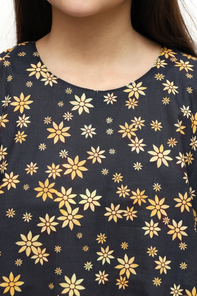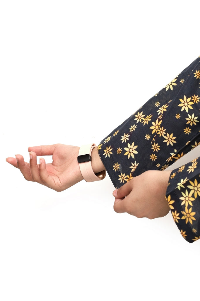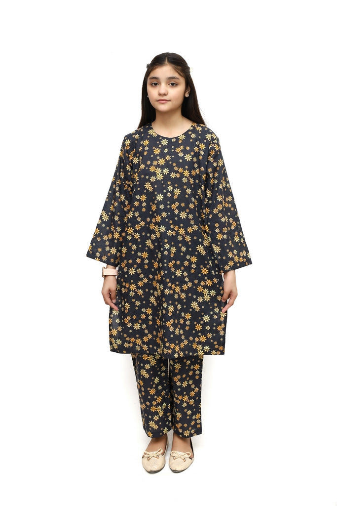 Elegant black digital lawn suit for girls featuring vibrant yellow flower prints. This 2-piece stitched ensemble combines comfort with style, perfect for casual wear and special occasions. The premium lawn fabric ensures breathability and durability, while the pre-stitched design offers convenience for busy families. Ideal for girls who love bold, cheerful patterns. Available in standard sizes for a perfect