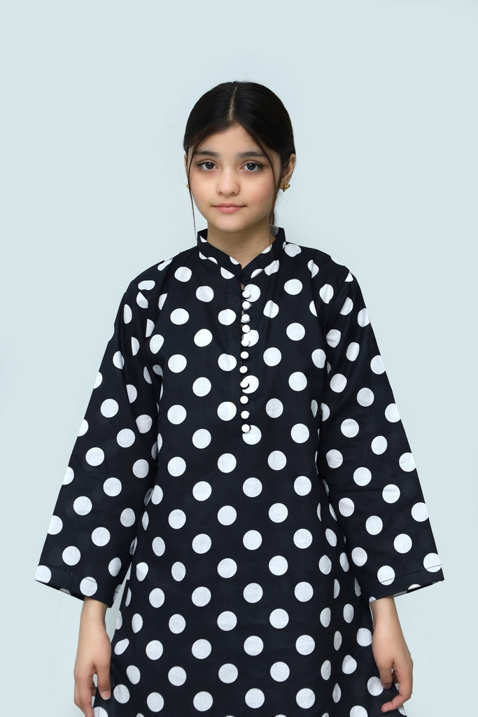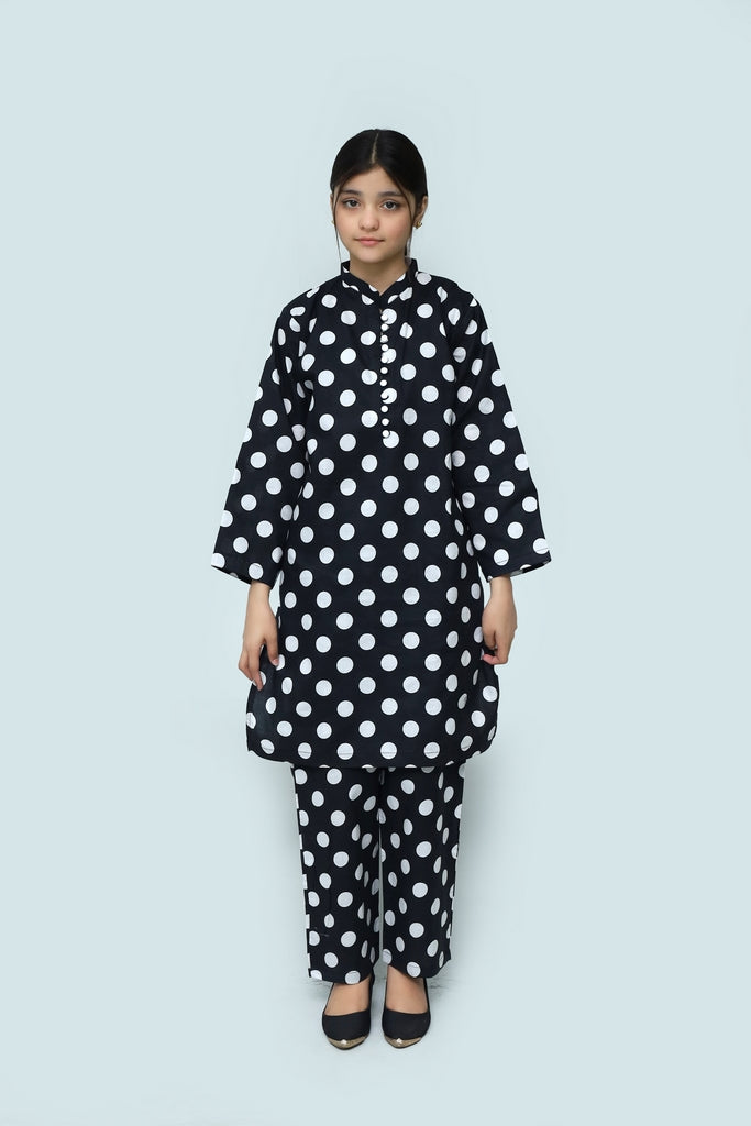 Elegant two-piece stitched suit crafted from premium digital lawn fabric. Features a striking black base with delicate off-white dot print throughout. Adorable fabric loops and button embellishments add charming detail to the design. Perfect for special occasions, celebrations, or everyday wear. The pre-stitched construction ensures a comfortable, well-fitted silhouette for girls. Soft, breathable fabric keeps her cool and comfortable all day long. A versatile addition to any young girl's wardrobe that combines style with practicality.