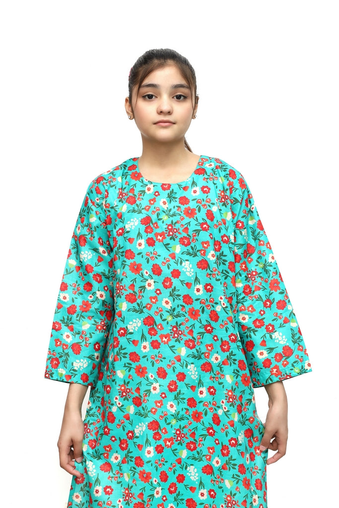 Elevate your girl's wardrobe with this stunning 2-piece stitched suit crafted from premium digital lawn fabric. The sea green base showcases vibrant red, orange, and white floral prints that bring a fresh, cheerful aesthetic. Pre-stitched for convenience, this suit offers the perfect blend of comfort and style for everyday wear or special occasions. Ideal for girls who love bold, colorful designs with traditional charm.