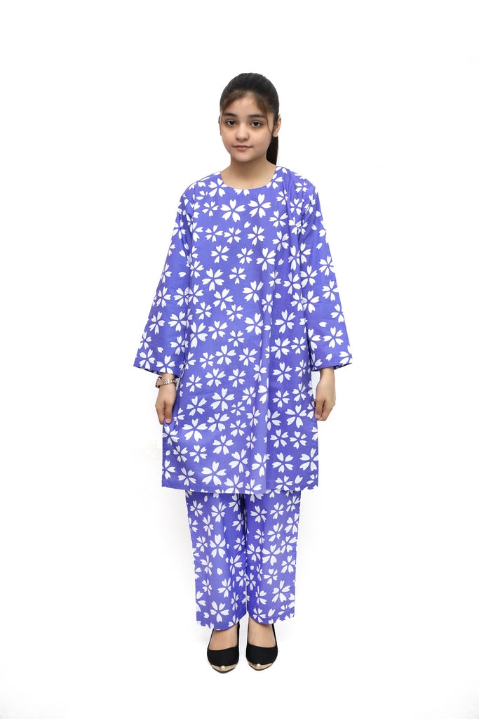 Meet the perfect outfit for your girl! This two-piece suit features a lovely dark lavender lawn fabric with pretty white flowers printed across it. Since it's already stitched, she can wear it right away without any waiting. The soft fabric feels great on skin and the flower design is super cute. Great for celebrations, visits, or just looking fabulous every day.
