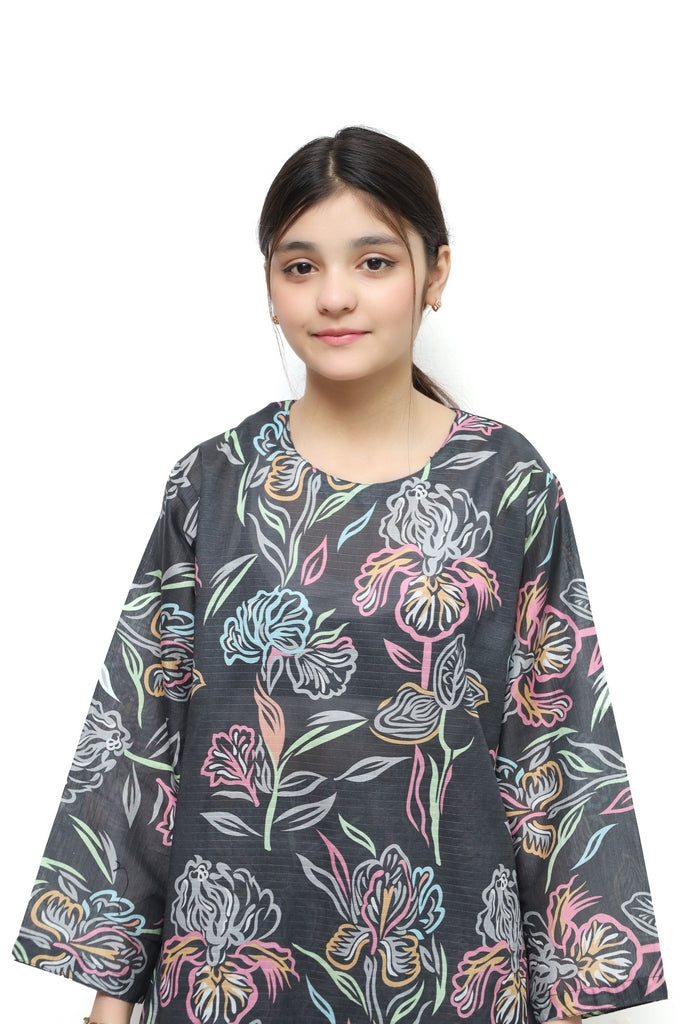 Plum Doriya Lawn 2-piece stitched suit for girls features a beautiful grey base with vibrant printed patterns in pink, sky blue, and green. This ready-to-wear ensemble combines comfort and style, perfect for casual wear, school events, or family gatherings. The premium lawn fabric ensures breathability and durability through multiple washes. Each piece is expertly tailored for a perfect fit, eliminating the need for alterations. Ideal for young girls who love colorful, contemporary designs with traditional appeal.