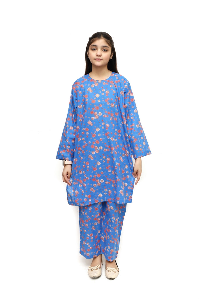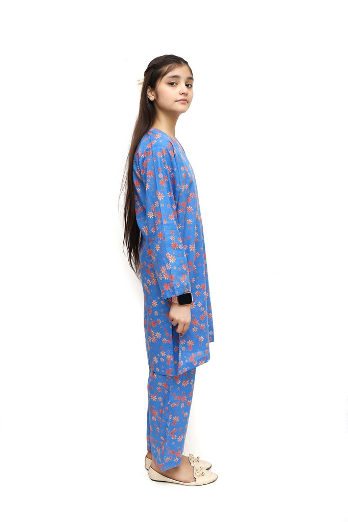 Elevate your girl's wardrobe with this stunning 2-piece stitched suit from Plum. Crafted from premium digital lawn fabric in a cool blue shade, it features vibrant orange flower prints that add a cheerful, modern touch. The suit comes fully stitched and ready to wear, offering comfort and style for everyday occasions, celebrations, or family gatherings. The soft, breathable fabric ensures all-day comfort, while the eye-catching floral design makes it perfect for creating memorable moments. Ideal for girls who love bold, colorful fashion.