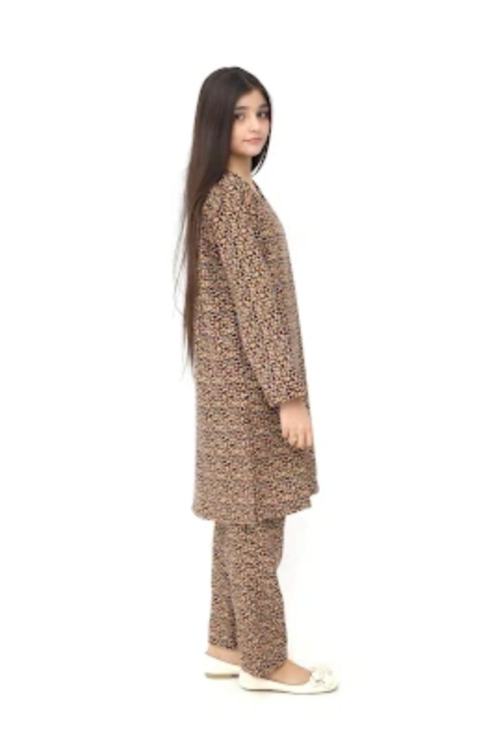 Liven up your little one's wardrobe with our Premium Quality Kotrai ( Imported Fabric ) Colour Dark Brown, Printed with Deep Yellow Green Flowers on 2 pc suit ! For Winters, this suit is not only high-quality, but also comfortable for all-day wear Casuals and Formals. Perfect for any stylish girl, this Stitched 2 pc suit is a must-have.