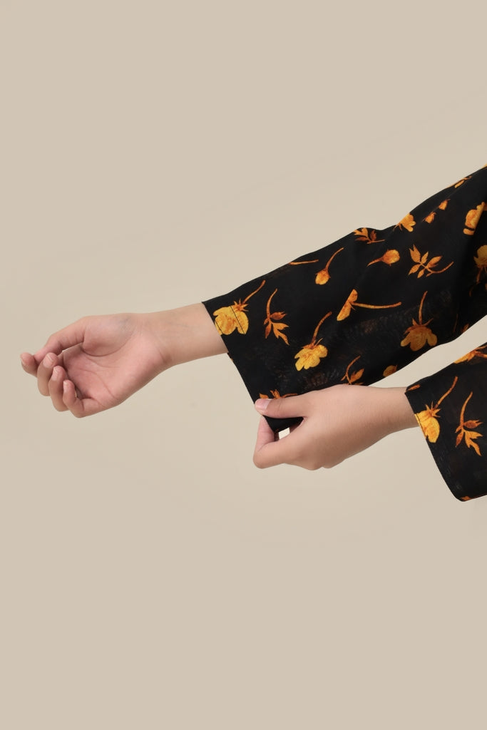 Liven up your little one's wardrobe with our Premium Quality Khaddar Colour Black, Printed with Golden Flowers on 2 pc suit ! For Winters, this suit is not only high-quality, but also comfortable for all-day wear Casuals and Formals. Perfect for any stylish girl, this Stitched 2 pc suit is a must-have.