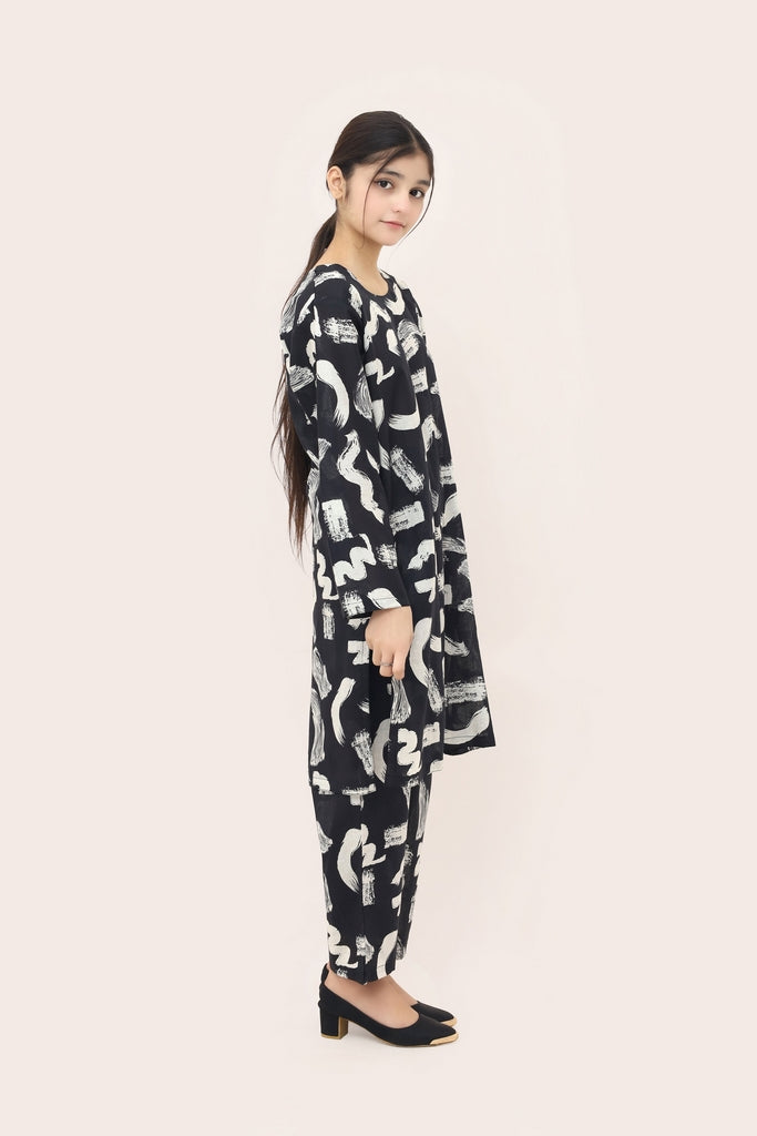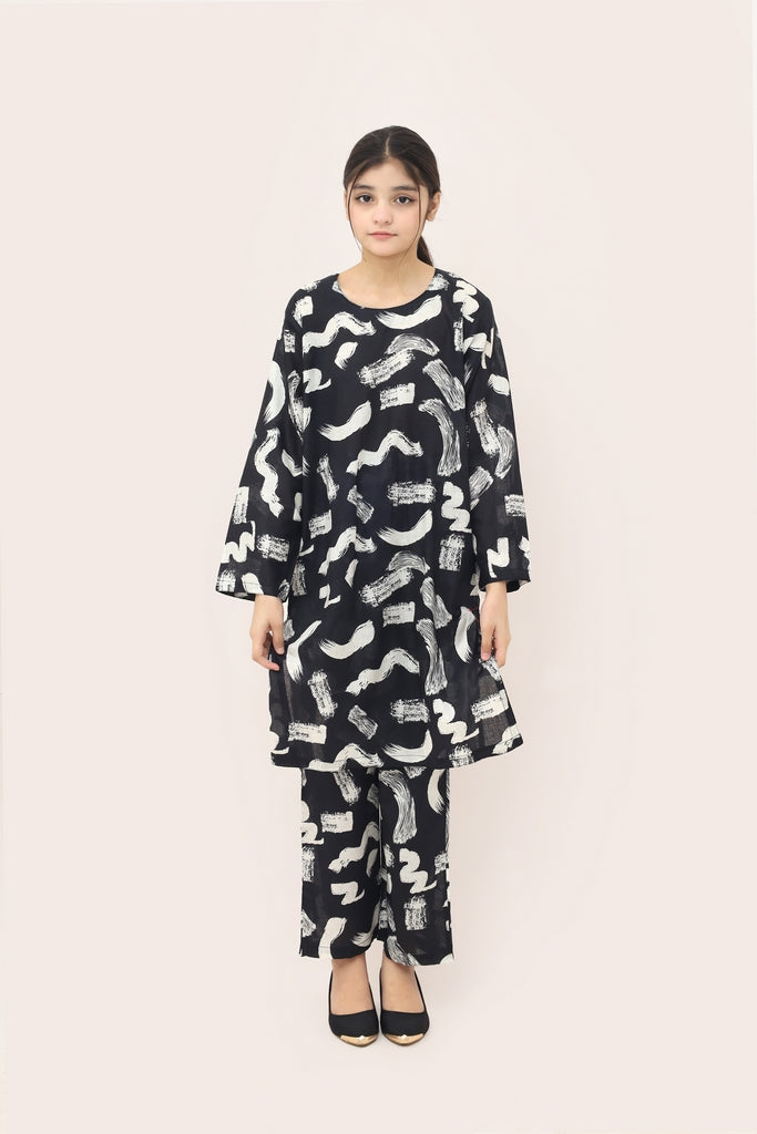 Liven up your little one's wardrobe with our Premium Quality Stitched 100% Soft Digital Lawn Black Colour Printed with White Patterns on 2 pc suit ! Made from premium 100% Cotton for Summers, this suit is not only high-quality, but also comfortable for all-day wear Casuals and Formals. Perfect for any stylish girl, this 2 pc suit is a must-have.