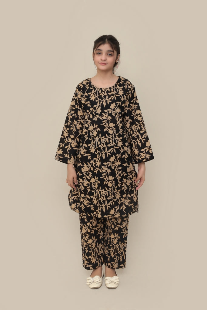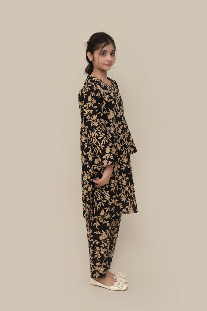 Liven up your little one's wardrobe with our Premium Quality Khaddar Colour Black, Printed with Beige Leaves and Stems on 2 pc suit ! For Winters, this suit is not only high-quality, but also comfortable for all-day wear Casuals and Formals. Perfect for any stylish girl, this Stitched 2 pc suit is a must-have.