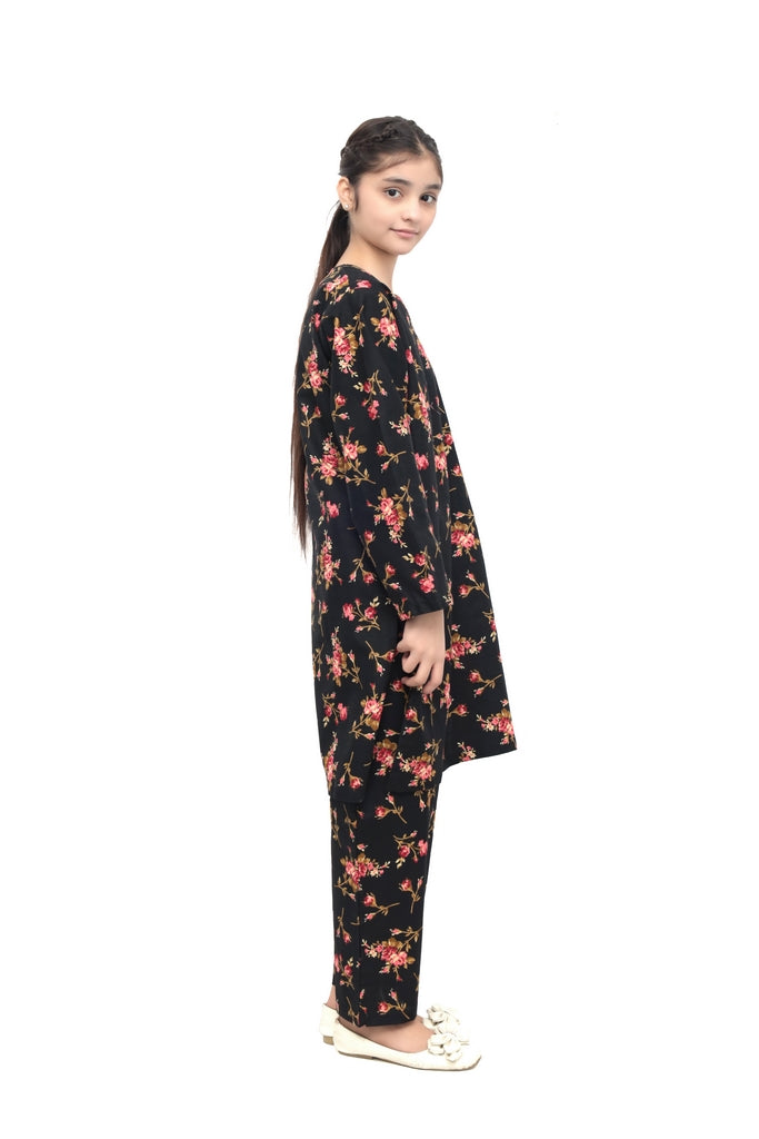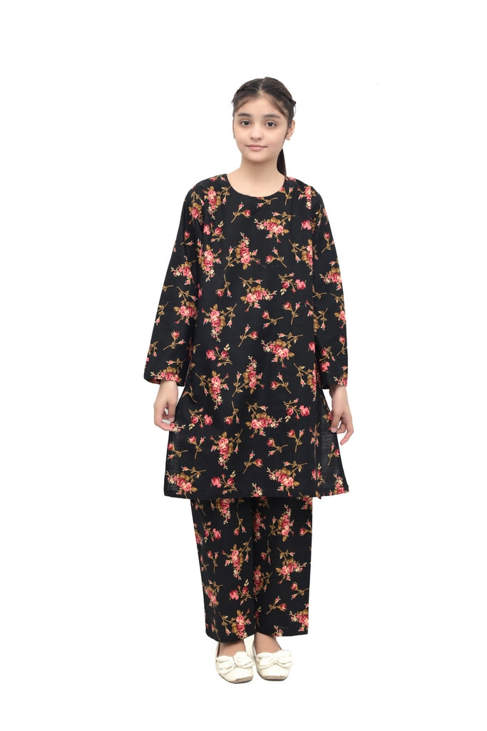 Liven up your little one's wardrobe with our Premium Quality Khaddar Colour Black, Printed with Pink White Olive Flowers on 2 pc suit ! For Winters, this suit is not only high-quality, but also comfortable for all-day wear Casuals and Formals. Perfect for any stylish girl, this Stitched 2 pc suit is a must-have.