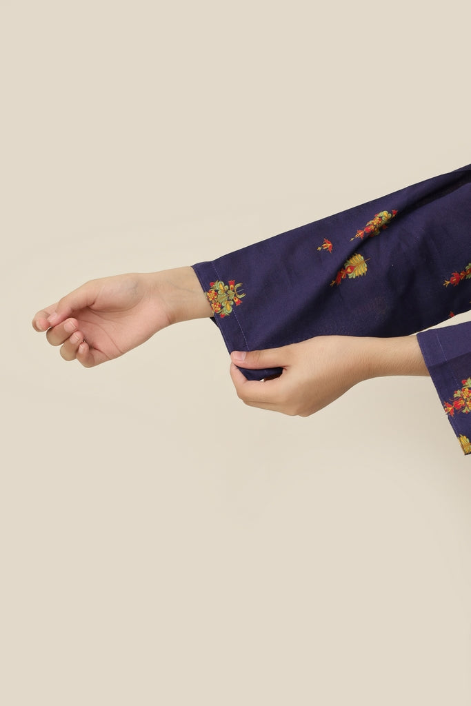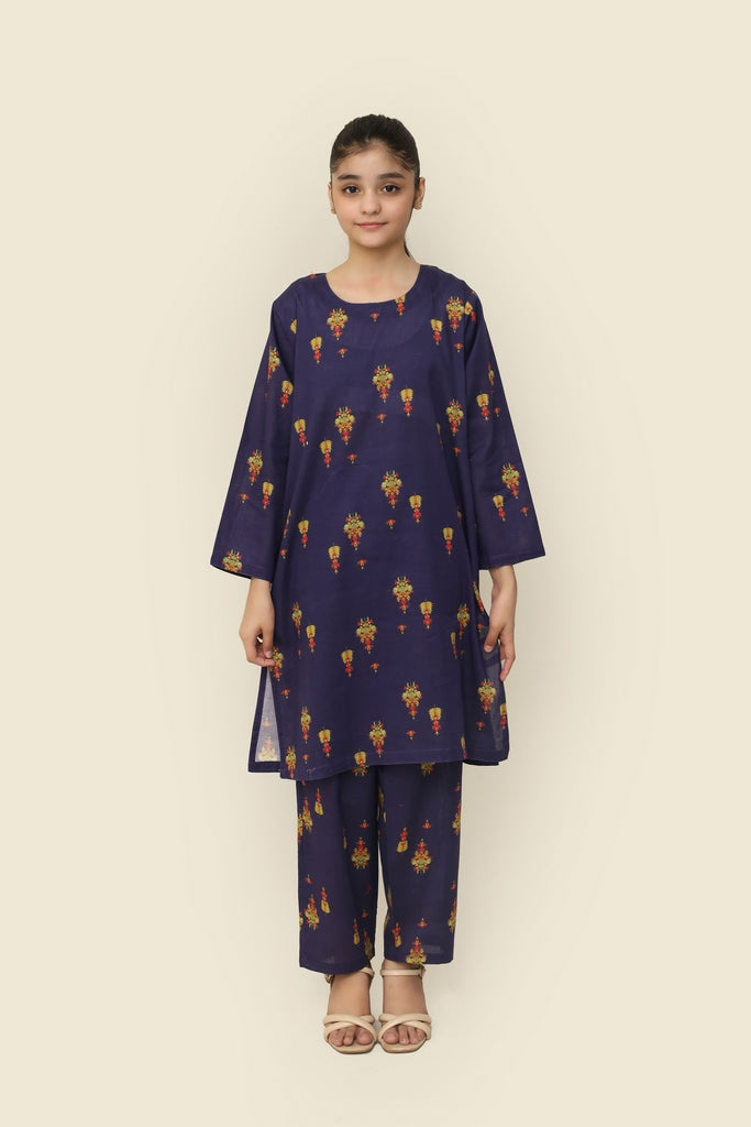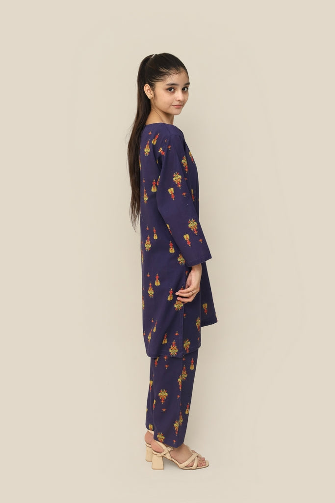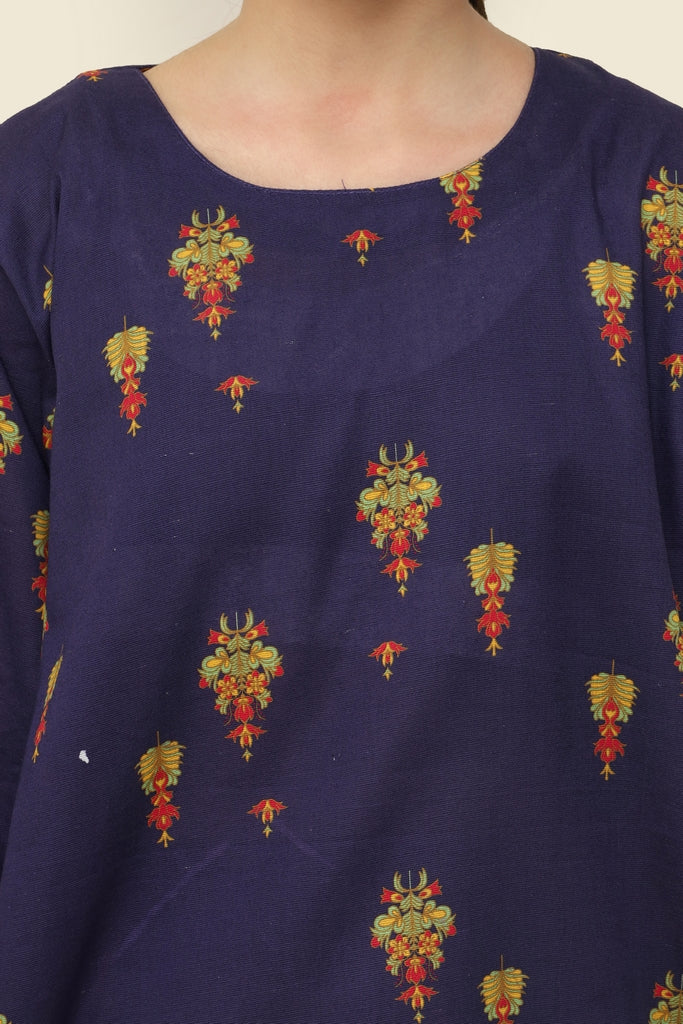 Liven up your little one's wardrobe with our Premium Quality Khaddar Colour Dark Blue, Printed with Red Yellow Green Flowers on 2 pc suit ! For Winters, this suit is not only high-quality, but also comfortable for all-day wear Casuals and Formals. Perfect for any stylish girl, this Stitched 2 pc suit is a must-have.