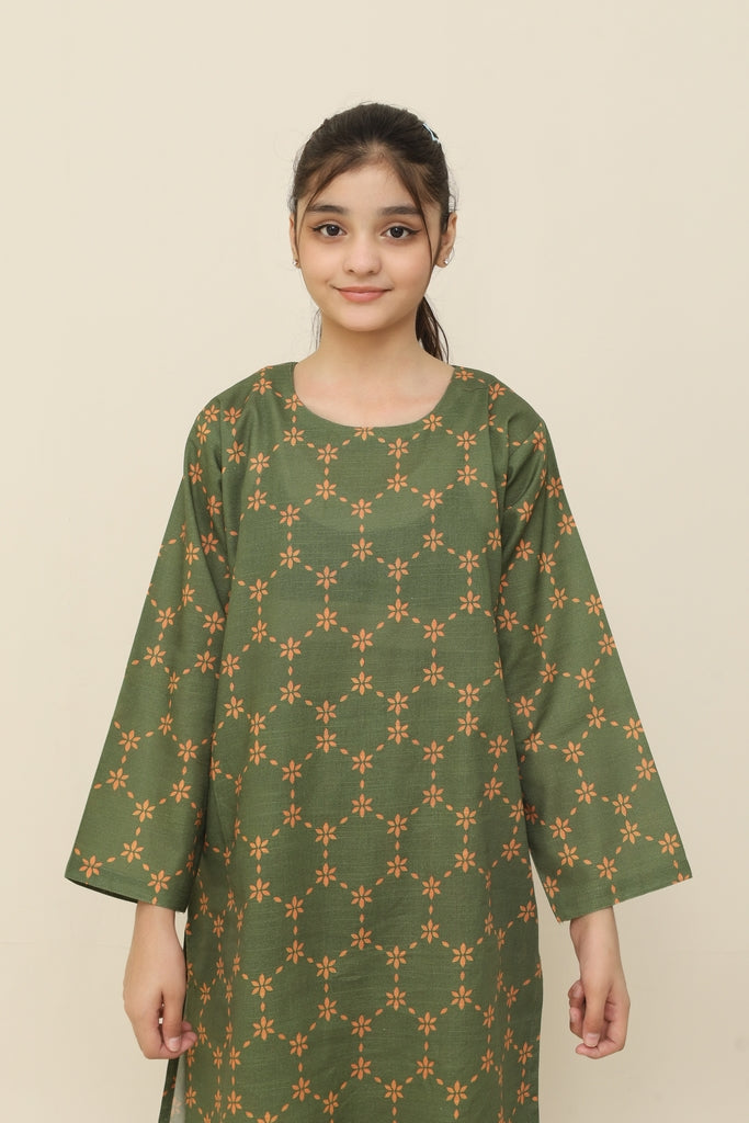 Liven up your little one's wardrobe with our Premium Quality Khaddar Colour Green, Printed with Yellow Patterns on 2 pc suit ! For Winters, this suit is not only high-quality, but also comfortable for all-day wear Casuals and Formals. Perfect for any stylish girl, this Stitched 2 pc suit is a must-have.