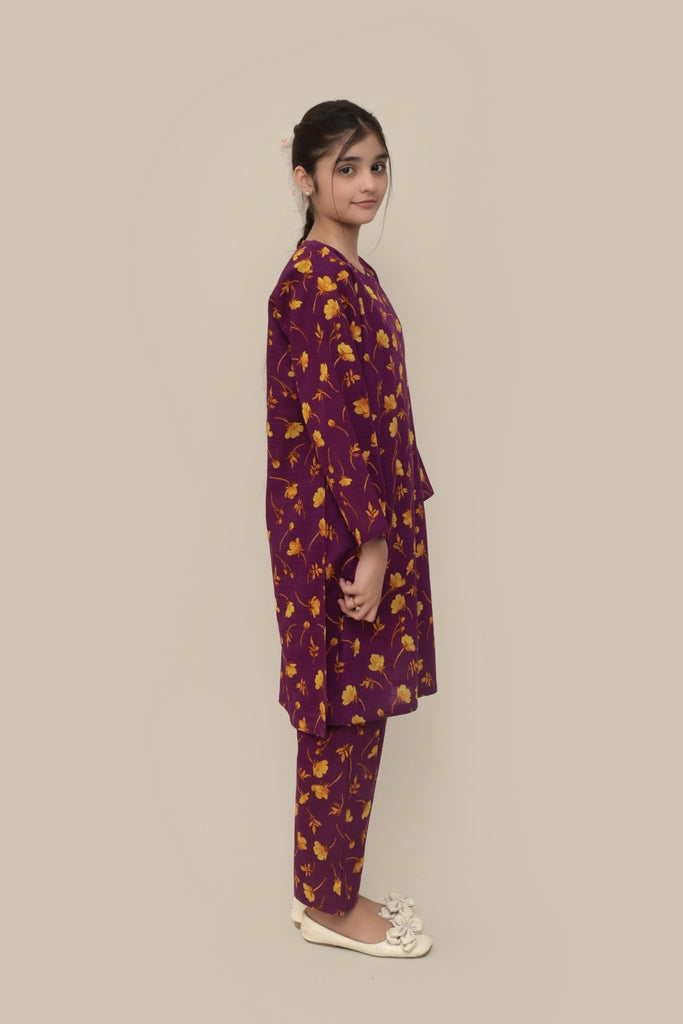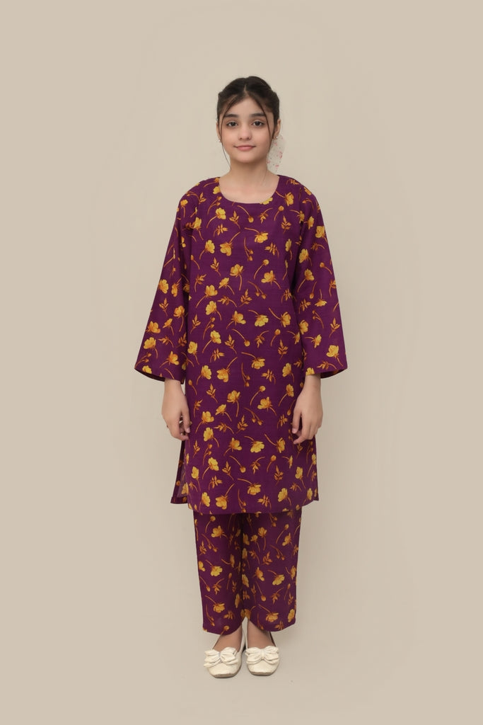 Liven up your little one's wardrobe with our Premium Quality Khaddar Colour Purple, Printed with White Golden Flowers on 2 pc suit ! For Winters, this suit is not only high-quality, but also comfortable for all-day wear Casuals and Formals. Perfect for any stylish girl, this Stitched 2 pc suit is a must-have.