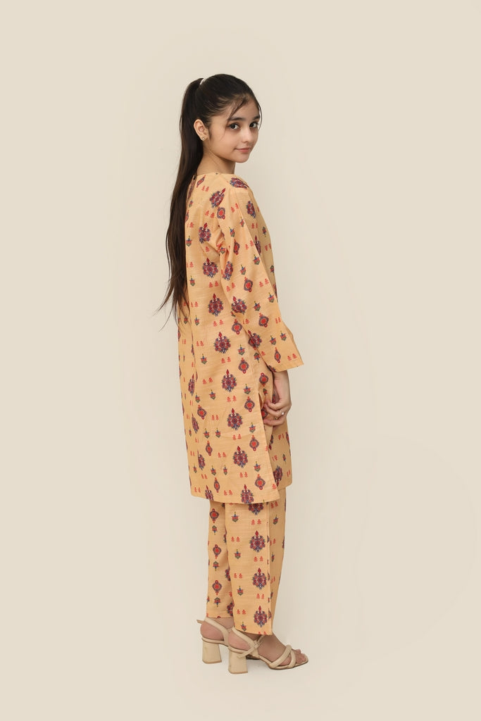 Liven up your little one's wardrobe with our Premium Quality Khaddar Colour Light Golden, Printed with Red Blue Yellow Flowers on 2 pc suit ! For Winters, this suit is not only high-quality, but also comfortable for all-day wear Casuals and Formals. Perfect for any stylish girl, this Stitched 2 pc suit is a must-have.
